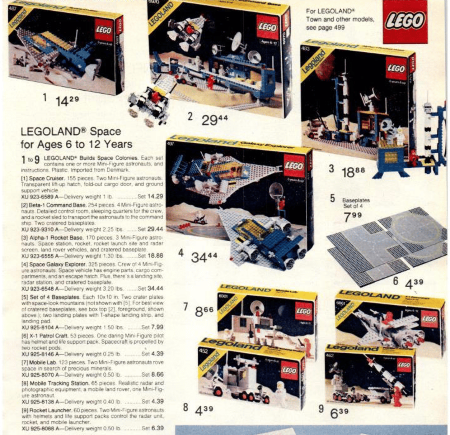 But for me, personally, the champion toy archetype were the Legos. Each year I would eagerly await a new set or two, hoping for more raw material to fuel my imagination. The Space series shown below were a classic - I had nearly every one of these packages. Legos occupied me for hours at a time - in my room, on a card table, building space bases and castles and cities and naval vessels. We eventually accumulated a trunk load of Legos, enough to cover any building contingency. They are one of the reasons I studied engineering in college, and remain - if you will - the building blocks of my childhood.